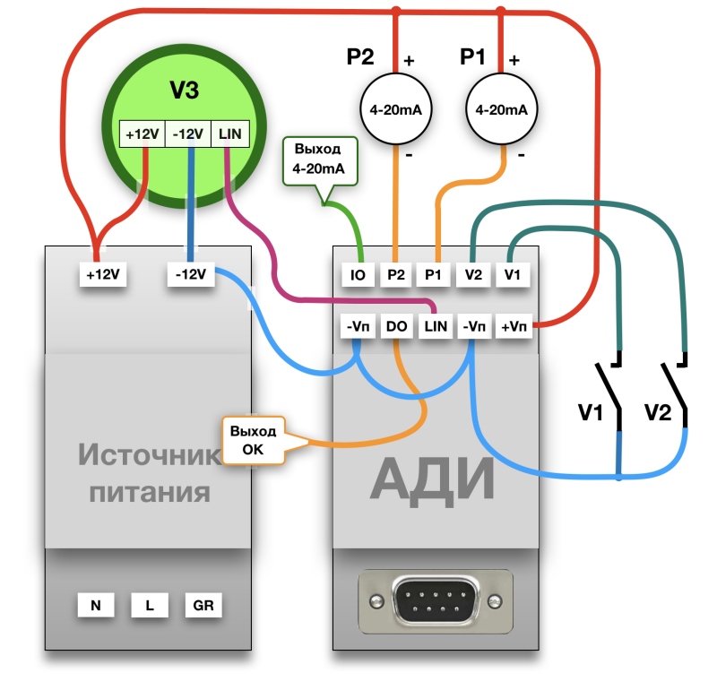 - P1, P2 — датчики давления ПДТВХ-1-01-1 с выходом 4÷20мА и напряжением питания от 9 вольт или другие датчики давления с отдельным питанием;